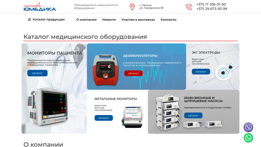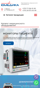 | AI-анализ | The website "Jumedica" is a Belarusian producer of medical equipment based in Minsk, located on ul. Gamarnika 30. The company offers a catalog of its products, including patient monitors, defibrillators, fetal monitors, infusion pumps, and ECG electrodes. The company aims to develop and manufacture high-quality medical equipment that meets modern medical requirements using advanced technologies. The products of "Jumedica" are certified and recommended for use in medical institutions. The website provides information on the company, news, participation in exhibitions, and contacts. The user interface includes a menu with sections on the company, news, participation in exhibitions, and contacts. The catalog features monitors for patients, universal and advanced defibrillators, fetal monitors, infusion pumps, and ECG electrodes for adults, children, and newborns. The |