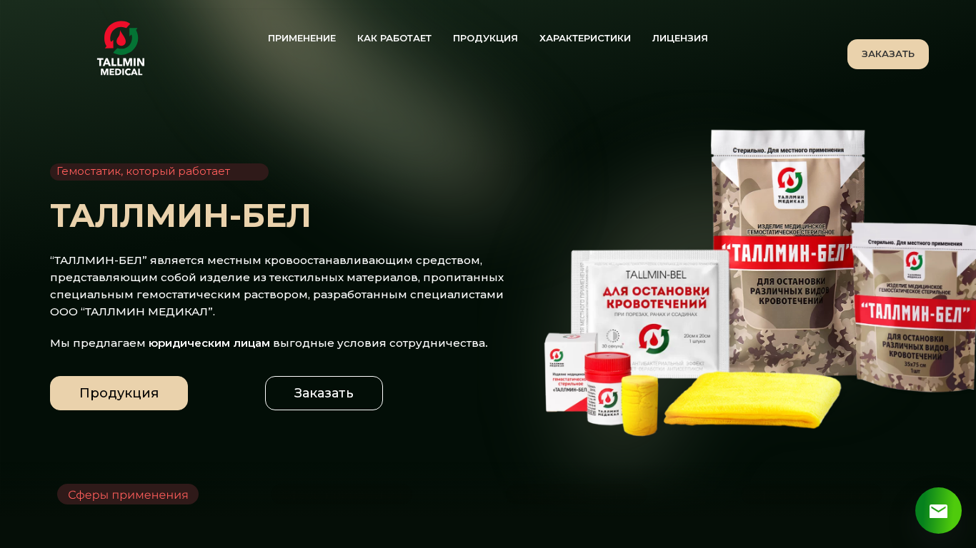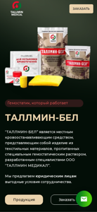 | AI-анализ | This website is dedicated to the sale of TALLMIN, a local hemostatic agent for stopping bleeding. The title of the website is "Гемостатик, гемостатическое средство для остановки кровотечения - ТАЛЛМИН" and it offers the product for purchase with delivery in Belarus and Russia. The description of the product mentions that it is a hemostatic agent made of textile materials soaked in a special hemostatic solution developed by OOO "ТАЛЛМИН МЕДИКАЛ". The website provides information on the product's application, how it works, and its characteristics. It is also mentioned that the product is suitable for various fields such as military medicine, disaster medicine, surgical practice, and veterinary medicine. The top keywords for the website include "таллмин-бел", |