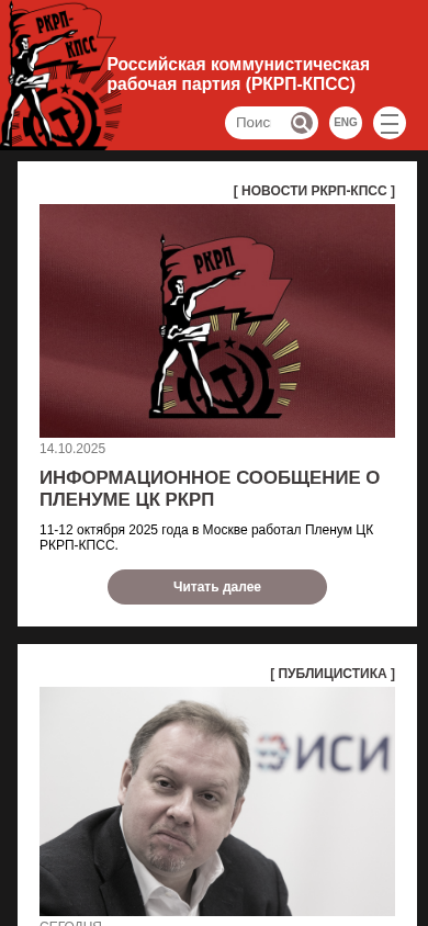 | AI-анализ | The web project "Российская коммунистическая рабочая партия (РКРП-КПСС) – Пролетарии всех стран, соединяйтесь!" is a Russian Communist Labor Party website. The site provides information about the party, its history, leaders, publications, programs, and work movements in various countries. It features articles, news, and information materials from comrades in arms. The site also includes links to documents, videos, and archives. The party's newspaper, "Мысль," is mentioned, with an announcement for its 10th issue of 2025. Additionally, there is a mention of a University of Workers Correspondents and a plenary session of the Central Committee of the party held in Moscow in October 2025. The site also contains various statements and articles on topics such |