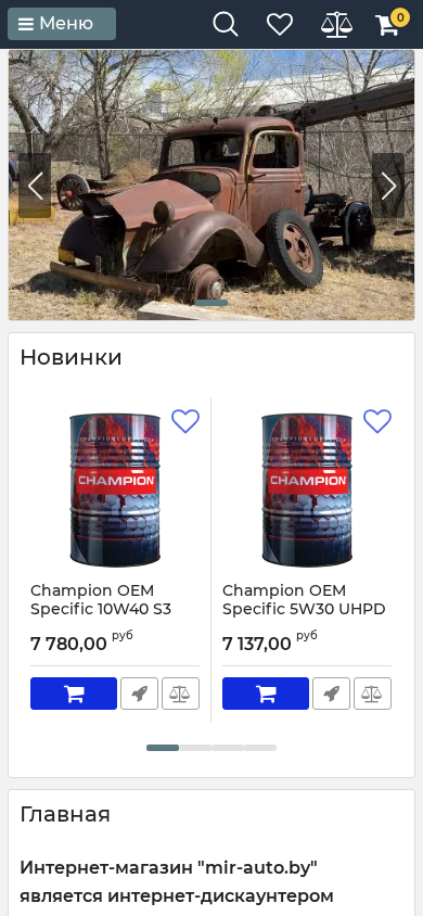 | SEO-описание | Интернет-магазин "mir-auto.by" является интернет-дискаунтером следующих категорий автотоваров: - масла и смазки (моторные масла для легковых и грузовых автомобилей, специальной и мототехники, промывочные масла, трансмиссионные масла для АКПП и МКПП, пластичные смазки, гидравлические масла, индустриальные масла (редукторные, компрессорные , турбинные, формовочные, СОЖ), универсальные тракторные масла; - о хлаждающие и технические жидкости (антифриз, тосол, СОЖ); - фильтры (воздушные, гидравлическ |