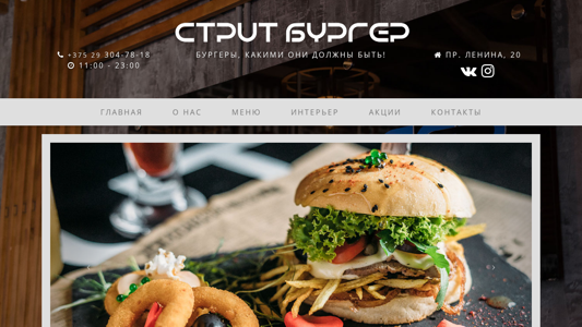 | AI-анализ | language: ru country: BY type: website category: food subcategory: burger This website is for Street Burger, a burger bar located in Gomel, Belarus. The title of the website is "СтритБургер - Бургеры, какими они должны быть!" (Street Burger - Burgers, the way they should be!). The description provides the phone number (+375 29 304-78-18) and the address (pr. Lenina, 20). The website offers a variety of burgers and also mentions an author's pie soup, pepper steak, pork ribs, and various desserts. The special offer on weekdays from 12:00 to 15:00 is a lunch menu at a price of |