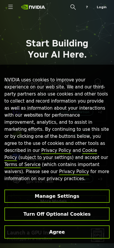 | AI-анализ | The portal "Try NVIDIA NIM APIs" is a website dedicated to enabling users to explore and utilize NVIDIA's leading models for building enterprise generative AI applications. The homepage invites visitors to start building their AI projects, offering free inference with various models, including Blueprints, GPUs, and Docs. Users can choose from different instance types, such as H200, H100, L40S, and A100, each with varying specifications and prices per hour. Additionally, the portal provides access to a Blueprint Collection, which offers workflows and code samples to help users build AI applications from the ground up. The website also includes Terms of Use, Privacy Policy, and a Contact section for users to manage their privacy choices and get in touch with NVIDIA. NVIDIA uses cookies to improve user experience and collect interaction data for performance improvement, analytics, |