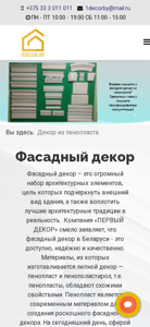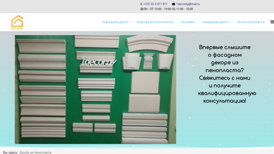 | AI-анализ | The web project "1ДЕКОР" offers a decorative facade solution using foam plastic in Brest, Belarus. The company provides a selection of mouldings and 3D design for facade decoration, with delivery available throughout Belarus. Affordable prices! Keywords: buy decorative facade Brest foam plastic decorative elements. The website includes information on carpets, columns, pilasters, cornices, crown mouldings, niches, plinths, rustic stones, arches, and decorative figures made of foam plastic. The company also offers cutting services for foam plastic and exterior advertising solutions, including logos and window dressing. The contact details for ordering and consulting are provided, along with business hours. The company claims to offer a lightweight and reliable decorative facade solution in place of heavy and cumbersome materials such as gypsum, concrete, |
