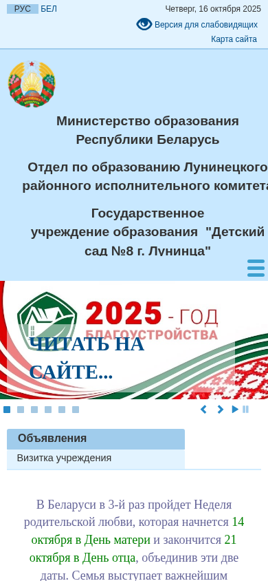 | AI-анализ | The portal "Детский сад №8 г. Лунинца" (Childcare Center No. 8 in the city of Luнинets, Belarus) provides information about the kindergarten, its administration, educational procedures, and various services. The website includes sections for administrative procedures, forms and applications, contacts for the educational committee, and information on the work schedules of the administration and the educational staff. Users can also find recommendations from the head of the physical education department, the music instructor, and the preschool education specialist. The website offers consultations for parents and teachers, as well as resources for correcting speech development in children with specific needs. The kindergarten's history, traditions, and achievements are also presented. The website is operated by the Ministry of Education in the Republic of Belarus, with the Luininec Regional Executive Committee overseeing the educational committee. The kindergarten follows |