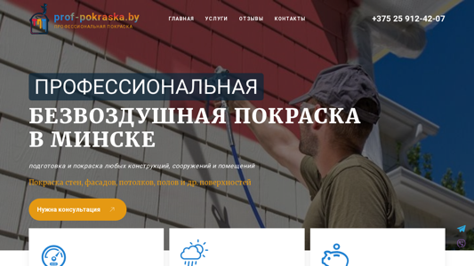 | AI-анализ | The website is a Belarusian company offering painting services in Minsk and the Minsk region. It provides various painting solutions for both exterior and interior spaces, including walls, facades, ceilings, and floors. The company specializes in using a "bezvodnaya" or "bezwodna" method, which is a pressure-fed painting technique that does not require compressed air. This method ensures a uniform and smooth finish, saving on materials and reducing drying time. The website also offers consultation services and provides contact information, including a phone number and a form to request a callback. The company's portfolio includes photos of completed projects, and it claims to have 12 years of experience. The website is available in Belarusian and Russian languages. |