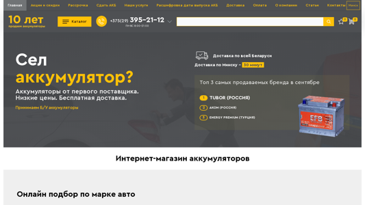 | AI-анализ | The web project Akkumulyatory.by is an e-commerce platform dedicated to selling automobile batteries in Minsk, Belarus. The website offers over 500 different models of batteries in its catalog, with free delivery available within Minsk and Belarus. Prices are listed for each item, and customers can add items to their cart for comparison. Keywords associated with the site include 'аккумуляторы для автомобиля' (accumulators for automobiles), 'аккумуляторная батарея' (accumulator battery), and 'цены' (prices). The site also includes sections for various types of batteries, such as those for diesel vehicles and electric cars, as well as charging devices and used batteries. The contact number for the company is provided, along with information about delivery, payment, and company details. The |