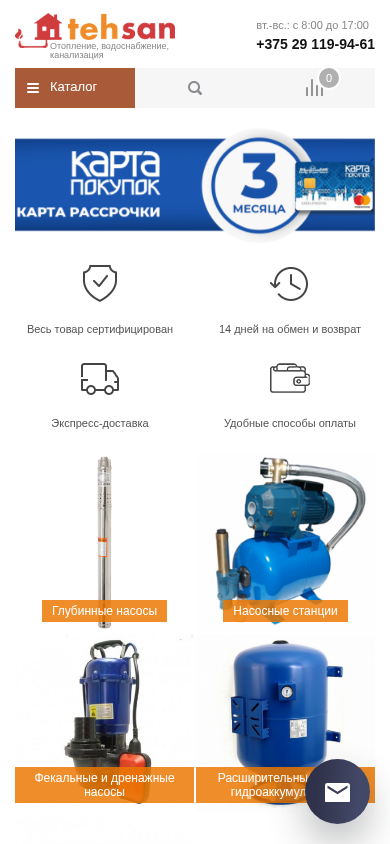 | AI-анализ | --- The website <www.tehsan.by> is dedicated to selling heating, water supply, and sewage systems. Its title is "Отопление, водоснабжение, канализация," and the description includes keywords related to these categories. The most frequent words on the site are "rub" (348 occurrences), likely a currency symbol, and "new" (322 occurrences), possibly indicating new products. The catalog section features brands and products for heating, water supply, and sewage systems, with contact information for inquiries. The site offers electric and gas heaters, water heaters, pipes and fittings, pumps, and various accessories. The catalog includes information on opening hours and a phone number for inquiries. |