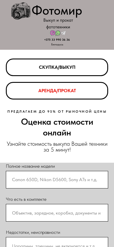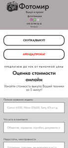 | AI-анализ | The web project "Скупка и выкуп фототехники" (Photomir) is a Belarusian website that offers a quick buyback service for contemporary photo technology. Users can sell cameras, lenses, and flashes from brands like Canon, Nikon, Sony, Fujifilm, Panasonic, and Olympus. The site provides an online valuation tool for users to estimate the worth of their equipment within five minutes. The full range of products accepted for purchase includes digital single-lens reflex cameras, digital rangefinders, some digital cameras, lenses, flash units, sync units, tripods, and other liquid photo and video equipment, as well as certain models of film-based cameras and lenses. The website does not buy stolen, found, or other people's items. It also does not accept damaged or faulty equipment or accessories, except in rare |