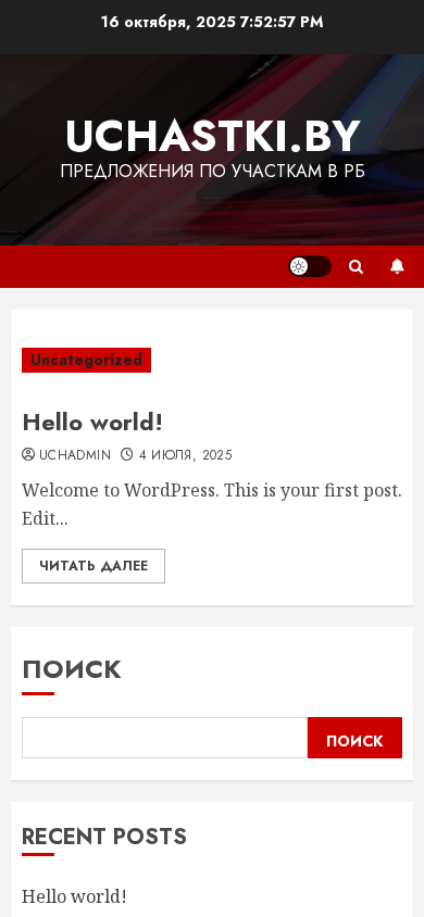 | AI-анализ | The website Uchastki.by is dedicated to offering proposals for plots in Belarus. The title and description of the website both contain the phrase 'Предложения по участкам в РБ', which translates to 'Proposals for plots in Belarus'. The website is built on WordPress, as indicated by the presence of 'WordPress' in the top_words and the 'Hello world!' post. The website has a light and dark mode switch, as well as a search function and a recent posts section. The main menu includes an 'Uncategorized' section, which suggests that the website may contain other types of content in addition to plot proposals. The website was last updated on July 4, 2025. |