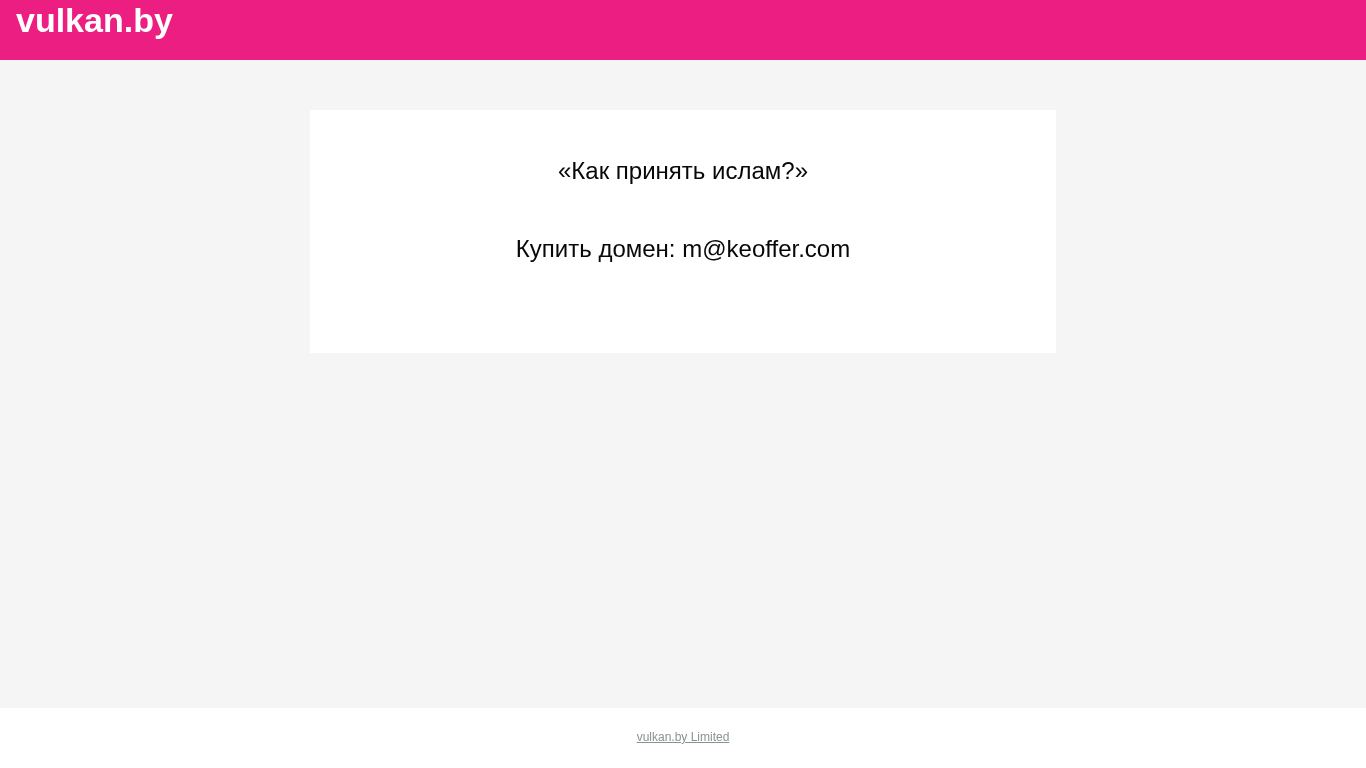 lang: ru The web project 'VULKAN.BY' is a Russian-language site primarily focusing on the topic of accepting Islam. Keywords associated with the site include 'vulkan', 'Russian', 'language', 'accept', 'Islam', 'buy', 'domain', and 'limited'. The site offers 24/7 support. The site's title is 'VULKAN.BY | На русском языке' and its description is 'Как принять ислам?' (How to accept Islam?). The domain is registered as 'vulkan.by' and the contact email for domain-related inquiries is m@keoffer.com. The site's content is limited.