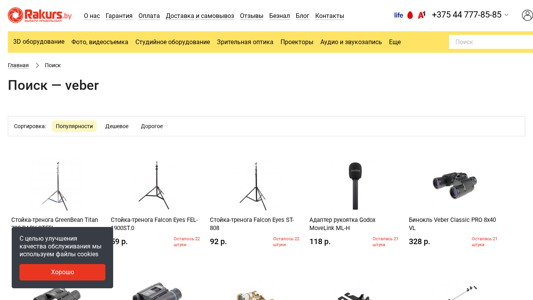 | AI-анализ | --- The portal Veber, located on the .by domain, is an e-commerce website operated by Rakurs.bay. It offers a wide range of products for purchase, including those related to photography, 3D printing, and accessories. The website provides delivery services in Minsk and Belarus, with options to pay in cash, by card, or through a bank transfer. The portal also features a blog, customer reviews, and several contact methods, including phone and email. Products available on the site include various 3D printers, scanners, plastics, and related materials, as well as photography and videography equipment, such as cameras, lenses, and accessories. Additionally, the portal offers video production equipment, including video mixers, converters, controllers, and cameras. The website's top searched keywords include "veber," "купить" (buy), "ми |
