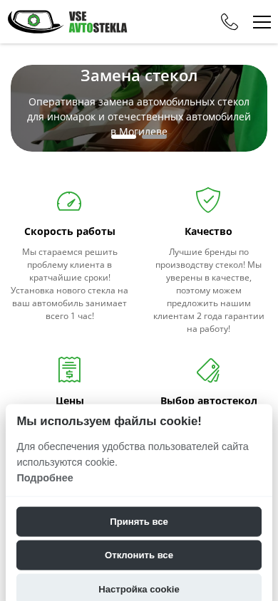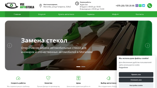 | AI-анализ | The website vseavtostekla.by is an auto glass sales and repair service based in Mogilev, Belarus. It offers installation, replacement, and repair of various types of auto glass for cars, trucks, and special vehicles. The company provides on-site removal and installation, as well as frame restoration services. Customers can place orders online or contact the phone number +375 (25) 725 25 05 for inquiries or appointments. The website includes sections for services, information, and contact details, including an email address (vseavtostekla106@mail.ru), physical address (Mogilev, ul. Gagarina, 32Ак2), and social media presence (Instagram). The company boasts quick and affordable services, with a claimed installation time of one hour and high-quality |
