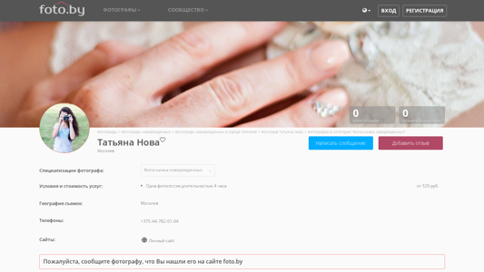 | AI-анализ | This online resource is a photography website featuring the work of photographer Tatiana Nova from Mogilev, Belarus. The website offers photographs in the category "Фотосъемка новорожденных" (newborn photography). Tatiana Nova specializes in various types of photography sessions including child and family, as well as newborn photography. She works in the cities of Mogilev, Minsk, Brest, and Gomel. The website includes a catalog of photographers, community for photographers, blog, announcements, and a contact section. Users can write messages, leave reviews, and view prices and conditions for services. The website is accessible in both Russian and Belarusian languages. The photographer's portfolio includes 67,634 photographs in the newborn photography category. Tatiana Nova's contact information includes a phone number and personal website. |