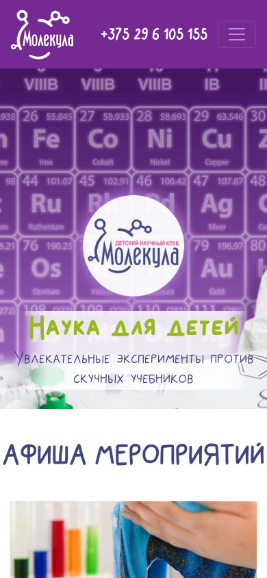 | SEO-описание | Детский научный клуб «Молекула» - это место, где дети проводят время весело, интересно. Создать опыты и эксперименты- любят дети всех возрастов. Совместный досуг с родителями или друзьями дает много эмоций. Приходите в молекулу, вам точно понравится. |