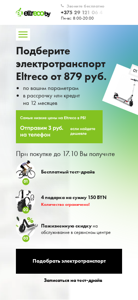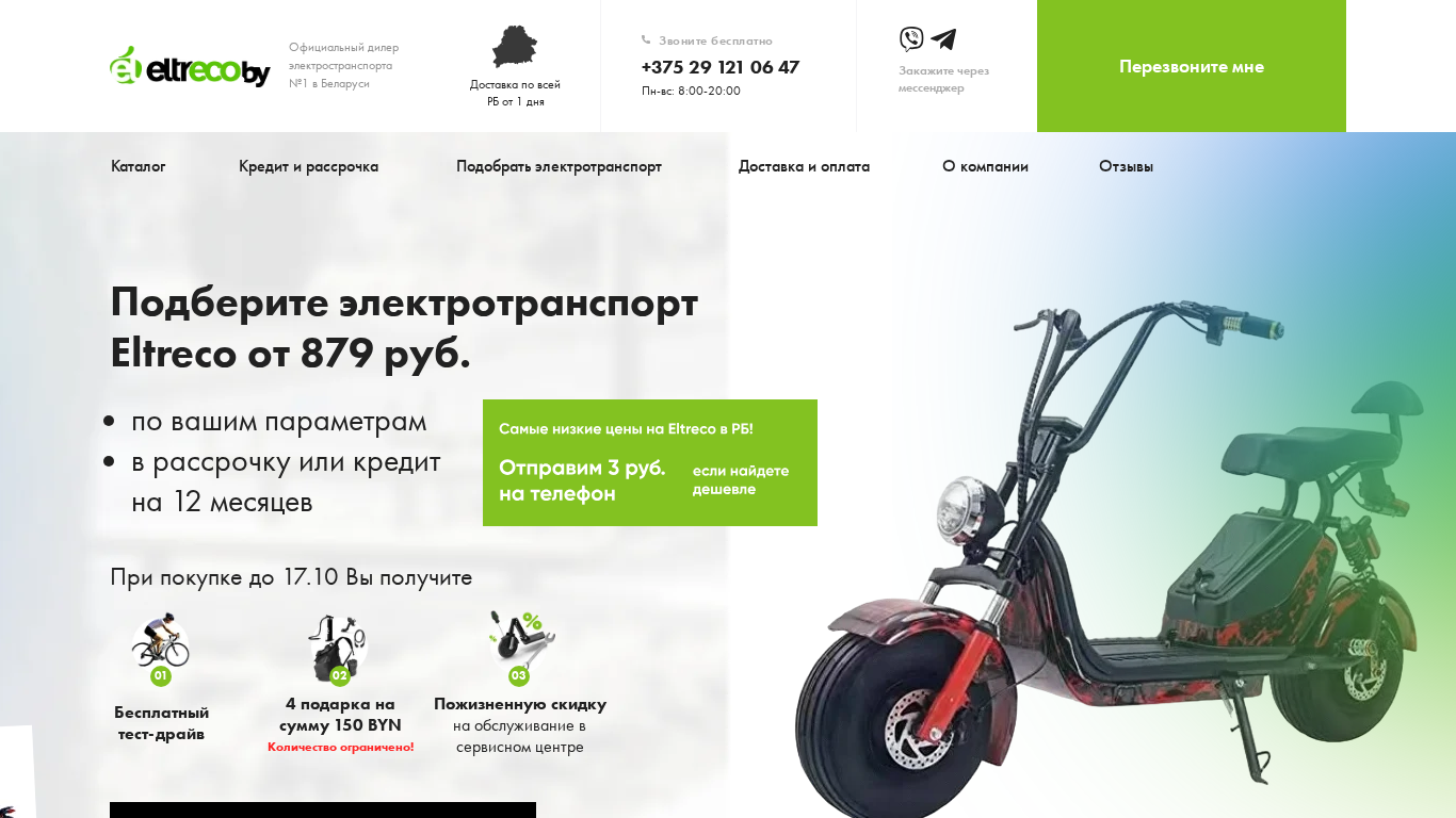 | AI-анализ | The portal Eltreco is an official dealer of electric transportation in Belarus, offering delivery across the country within one day. Users can call a free hotline at +375 29 121 06 47 from Monday to Sunday between 8:00 and 20:00. The website provides the opportunity to choose an electric transport from Eltreco with prices starting at 879 rubles, in installments or credit for a year. A free test-drive is available, along with four gifts worth 150 BYN for limited time. Users can also enjoy a lifetime discount on service center maintenance. Multiple electric transport options are presented, including CITYCOCO SMD X7 mini, HIPER ENGINE FEST F2, and HIPER Stark DX801, with respective monthly prices of 90, 6 |
