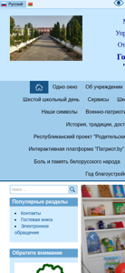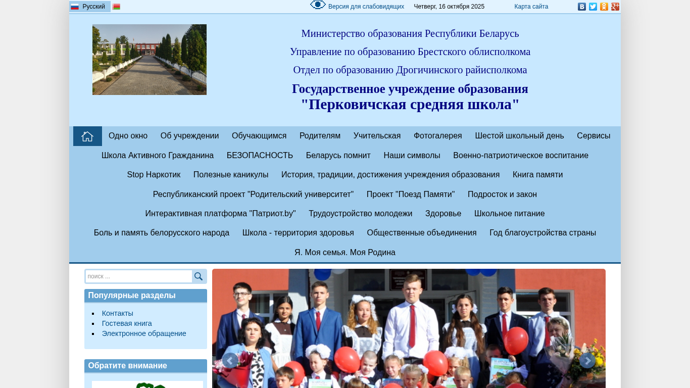 | AI-анализ | The web project "Перковичская СШ" (Perkovichskaya SS, Perkovich Secondary School) is a website operated by a state educational institution located in Drogichin, Belarus. The homepage features an announcement of the school's organization, contact information, and links to various sections including "About the Institution," "For Parents," "Teacher's Gallery," and "School Services." Key topics on the site include education news, ministries of education, and a calendar of events. The site also includes sections on safety, patriotic education, and various projects. Users can access a cafeteria menu, a parent survey, and a guestbook. The design is standard with a mid-sized font, standard line spacing, and a gray color scheme. Images are disabled, and the site is accessible for visually impaired users. The site has |