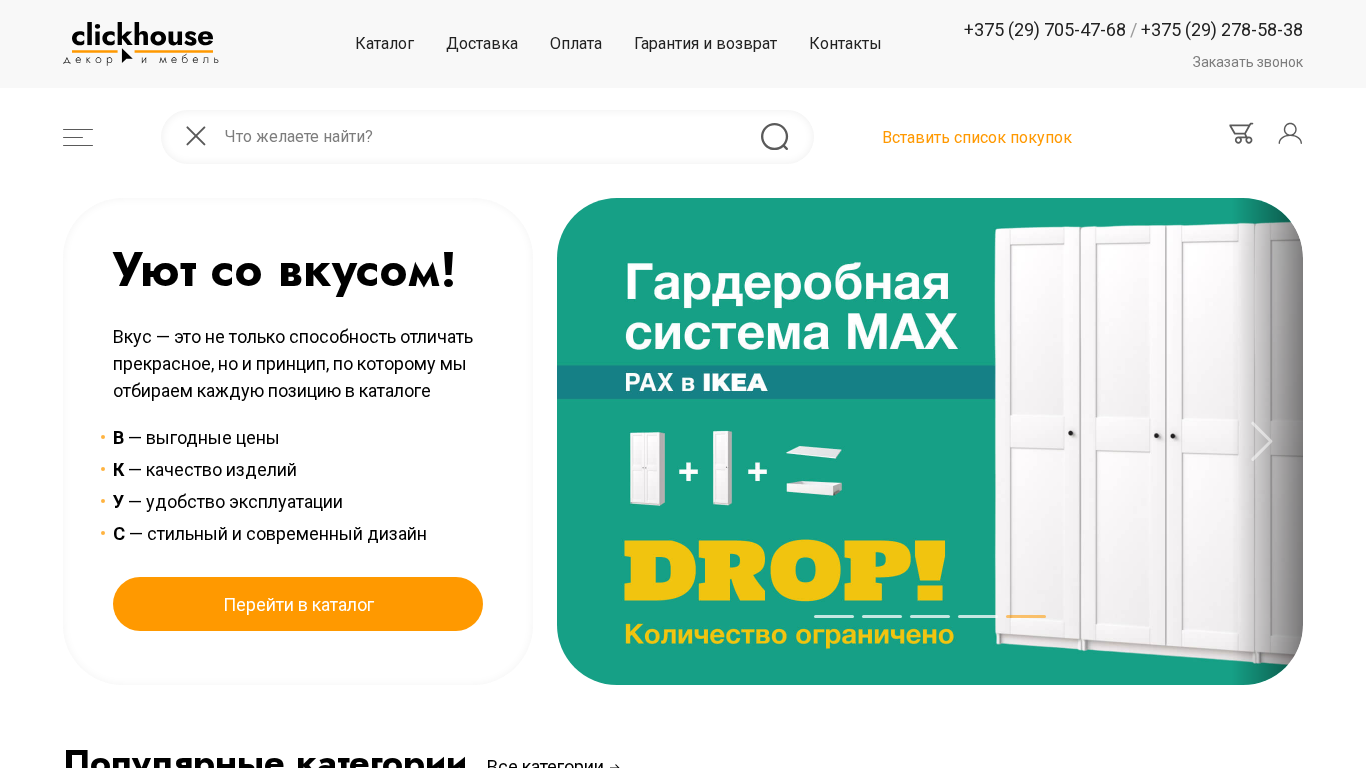 | AI-анализ | --- The portal "clickhouse.by" is an e-commerce website specializing in home furniture and decorative items. The website offers a wide range of products from reputable suppliers, emphasizing quality, functionality, and style. The homepage features a catalog with various categories, including furniture, textiles, children's items, household appliances, and more. Users can browse through the catalog, view products in stock, and apply filters to narrow their search based on price, delivery, and payment options. The website also provides details about delivery, payment, guarantee, and return policies, as well as contacts for customer service. The design is modern and user-friendly, with sections dedicated to popular items, discounts, and customer reviews. The website is available in Belarusian language, with the title "Мебель и товары для дома | Интернет-магазин" and the description " |