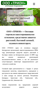 | AI-анализ | The website is for OOO "Trion," a Belarusian company specializing in the optic sale of plant protection products, seeds, and household chemicals. Established in 1994, Trion is one of the leading organizations in Belarus for the distribution of these items, with offices and warehouses in various regions including Brestskaya oblast, Homelskaya oblast, Hrodna oblast, and Minskaya oblast. The website offers a wide range of products, including plant protection chemicals and fertilizers, packaged seeds, rodent and insect control, and gardening tools. The company aims to meet the demands of discerning customers with a constantly evolving product line. The head office is located in Hrodna. |