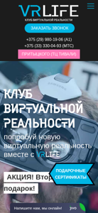 | AI-анализ | The website VRLIFE is a virtual reality studio or park located in the center of Minsk, Belarus. It offers rental and attendance for various events. The website mentions HTC Vive and PlayStation as virtual reality technologies used in their offerings. There are multiple gaming zones, including auto simulators and PlayStation 5, with various pricing options available for rental periods ranging from 15 minutes to 2 hours. The website also mentions an ongoing offer for a free second VR headset for bookings before 17:00 during weekdays, valid until October 31, 2025. The website includes a blog and contact information, with locations at TS Tivali Pav. 226A and phone numbers for A1 and MTS networks. |