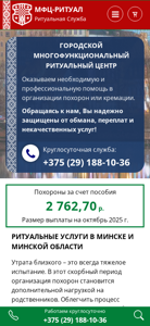 | AI-анализ | The website is the official site for the Multi-Functional Ritual Center in Minsk, Belarus, offering quality ritual services for funerals and other purposes. The center provides a full range of services including funeral organization, funeral agent, transportation of the deceased, cremation, VIP funerals, rental catafalque, mourning services, toilet for the deceased, and a ritual shop for purchasing funeral items such as wreaths, coffins, and urns. Services are available 24/7, and customers can place a free call to inquire or make arrangements. The site also features sections for pricing, information on funeral procedures, and company background. |