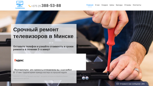 | AI-анализ | --- The web project tv-service.by is a website dedicated to TV repair services in Minsk, Belarus. The website claims to repair over 85% of TVs within a day. The homepage includes sections for the company, pricing, brands, customer reviews, and contacts. The website offers a quick repair estimate and a guarantee on all types of repairs for up to three years. The main repair services include fixing issues with power sources, control boards, TV tuners, system plates, and screens. Common problems like no power or no signal are also addressed, as well as repairs for the power supply block, control panel, and remote control. The website states that their specialists, with years of experience and certified qualifications, can repair TVs both at home and in the workshop, and they work with all TV manufacturers. The site also offers a 20% discount for services booked through the website and a |