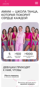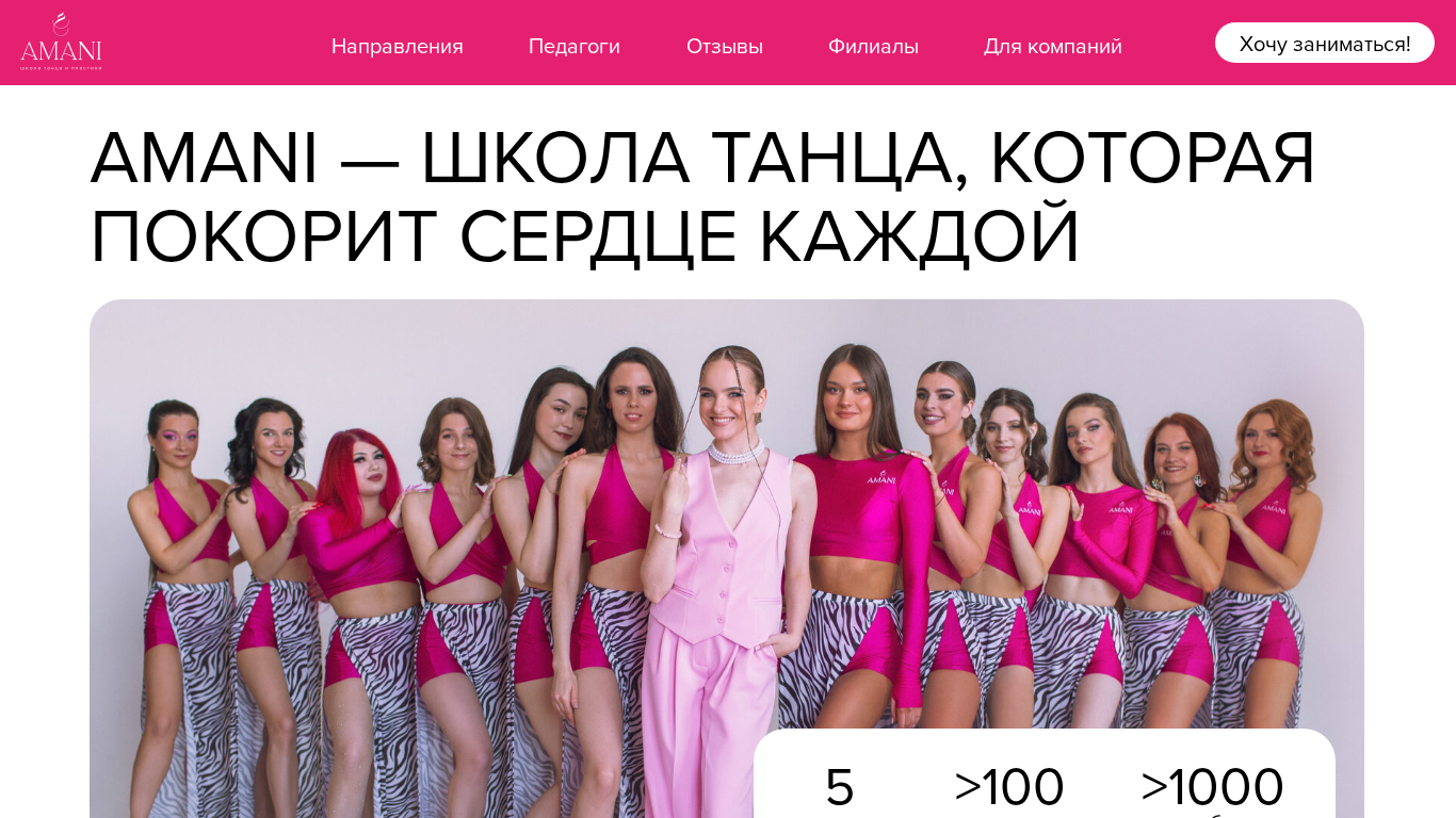 url_path: / language: ru country: BY type: website category: Education subcategory: Dance School industry: Dance intended_audience: Females intended_use: Recreational size: Medium status: Active The web project "AMANI | Школа танца и пластики" is a medium-sized, active website in the dance education subcategory of the dance industry. It targets a female audience for recreational purposes. The website offers five types of classes: Eastern dance, Latin, Yoga, Pilates, and MFR Stretch, with four locations in Minsk conveniently situated near metro stations.