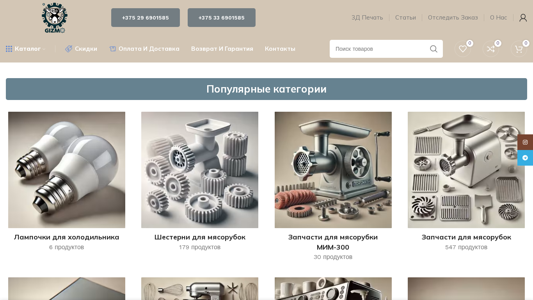 | AI-анализ | The website 'Gizmo' is an online store selling spare parts for home appliances. It has been in operation since 2015 and delivers within Belarus and Minsk. The homepage includes options for quick search, adding items to a wish list, comparing products, and viewing articles. The contact information is provided, including phone numbers for Minsk and Belarus. The main menu offers sections for catalog, discounts, payment and delivery, returns and warranty, and contacts. Popular product categories include parts for refrigerator lamps, mixer shafts, coffee machine parts, and cleaning supplies. The site also features a filter for availability and quick delivery. Some items are noted as being in stock and priced in Belarusian rubles. Delivery within Minsk and all of Belarus starts from 3 BYN. The website allows users to view product details, add items to |