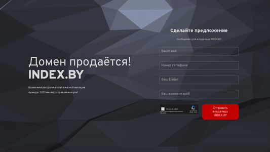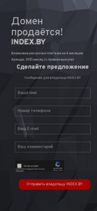 | AI-анализ | language: ru The website INDEX.BY is the official site for the .BY top-level domain registry, Internet.by. The site offers information about the domain registration and rental services, as well as the possibility of purchasing an existing domain through a six-month payment plan or outright. Users can make offers for specific domains and contact the domain owner via provided contact information. The site also promotes simple and understandable domain names for businesses, with additional contact details for inquiries. The site is in Russian and was last updated in 2025. |