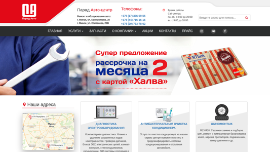 AI-анализ | The web project "Parad Auto" is a large car repair and service center located in the Frunzensky district of Minsk, Belarus. Equipped with modern German machinery and staffed with 15 service stations and 9 lifting platforms, it offers a range of services including diagnostics, repairs, and maintenance for various automotive systems and components. Customers can contact the center via the phone numbers +375 29 325 09 09, +375 33 325 09 09, and +375 17 317 00 06. The repair shop's hours of operation for the call center are Monday through Saturday from 8:00 to 20:00 and Sundays from 9:00 to 18:00. Services provided |