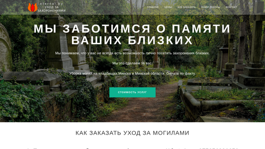 | AI-анализ | This online resource is dedicated to providing grave maintenance services for clients in Minsk and the Minsk region. The website title is "Уборка могил - Уход за могилами" which translates to "Grave Maintenance - Care for Graves". The description includes keywords such as "уборка" (cleaning), "заказать" (to order), "могил" (graves), "захоронения" (burials), "оплата" (payment), "уходу" (care), "банковской" (bank), "цены" (prices), and "бyn" (.BY domain). The top words on the website include "уборка" (nine occurrences), "заказать" (six occurrences), "могил" (four occurrences), and "услуг" (services |