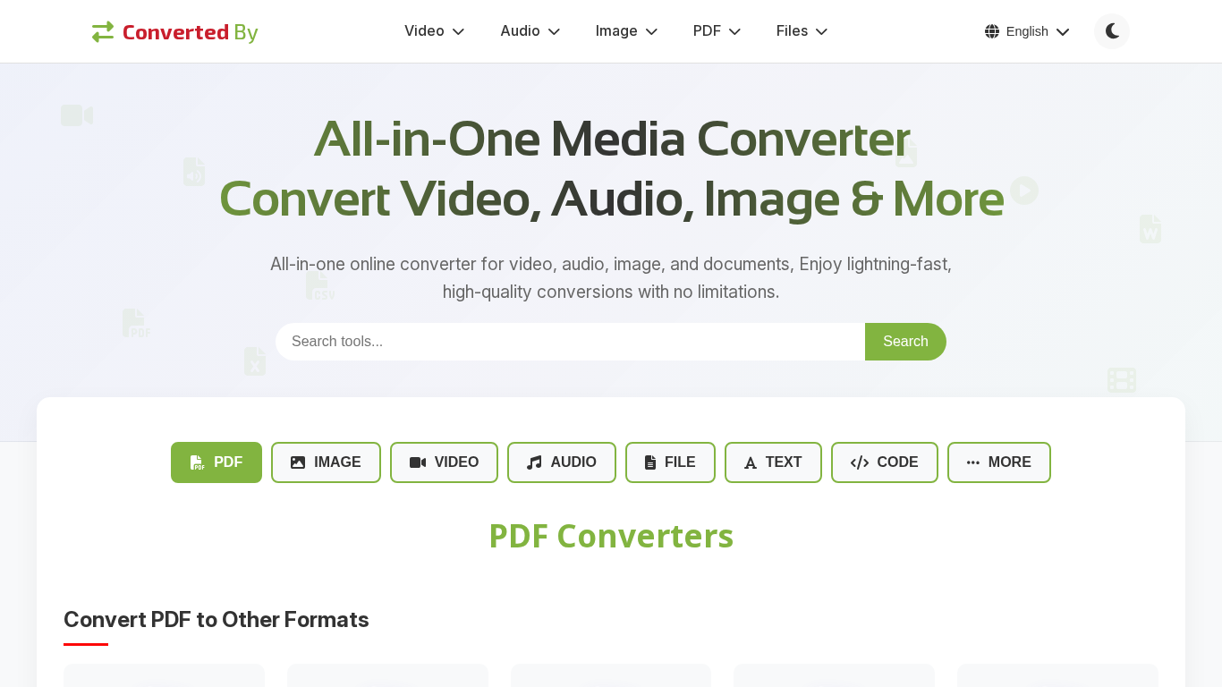| AI-анализ | This website, titled "Converted.by - Easy Online File Converter - No Signup Needed," offers a range of free online converters for various file formats including video, audio, image, and documents. The top words in the metadata indicate that PDF, open, convert, online, and converter are the most common terms used. The website provides tools for converting PDF to various formats, as well as video to GIF, audio formats, image formats, and file types like CSV and Excel. It also offers an all-in-one media converter for converting multiple file types at once. Users can convert files without the need for sign-up. |