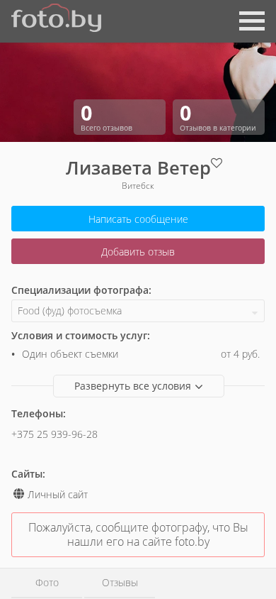 | AI-анализ | --- The web project "Lizaveta Veter Photography" is a website for a photographer based in Vitsebsk, Belarus. The site focuses on food photography, with a category dedicated to this type of work. The photographer, Lizaveta Veter, offers her services as a wedding and food photographer in Vitsebsk. The site includes a catalog of photographers, with Lizaveta's works featured in the food photography category. Other categories include various types of photography such as architectural, portrait, and industrial. The site also includes a community for photographers, as well as statistics and a blog. The site was visited on February 13, 2020, and has no reviews in the food photography category. Lizaveta Veter's services include individual photo sessions and wedding photography, with prices starting at 4 rubles per object. She covers shoots in Vitsebs |