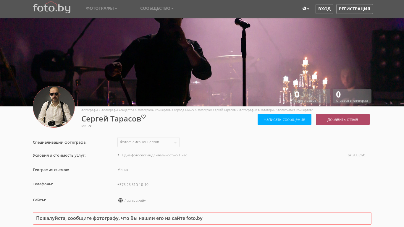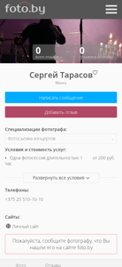 | AI-анализ | The portal is a photography website featuring the work of Sergey Tarasov, a photographer based in Minsk, Belarus. The site specializes in concert photography, with a dedicated category showcasing his photos. Sergey Tarasov offers his services as a concert photographer in Minsk. The site includes information about his pricing, which starts at 200 rubles for a one-hour photo session, and his contact information, including a phone number and personal website. The site also includes a community section for photographers and a blog. The domain is star.foto.by. |