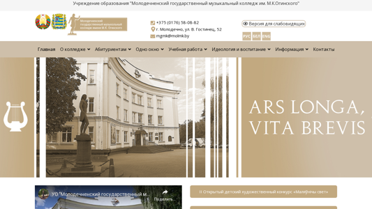 | AI-анализ | The web project "Молодечненский музыкальный колледж им. М.К.Огинского" (Molodechnensk State Musical College named after M.K. Oginski) is a Belarusian educational institution offering music education. The website provides information about the college, including its location in Minsk region, contact details, and a selection of topics such as news, documents, orchestra, instruments, and choir. Keywords associated with the site include 'orchestra', 'information', 'Oginowski', 'Minsk region', 'music', and 'education'. The top words on the site are 'orchestra' and 'information', each appearing about fifteen times. Other frequently mentioned topics include 'news' (eight occurrences), 'documents' (eight occurrences), and 'musical instruments' (nine occurrences). |