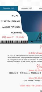 | AI-анализ | The website Competition 2025 | Mysite is dedicated to the 14th Riga International Competition for Young Pianists, scheduled to take place on October 17th-18th, 2025, at the Golden Hall of the Riga Latvian Society, Merkela Street 13. The competition includes categories for Senior and Junior pianists, with subcategories for each level. The schedule consists of performances on both days, with the announcement of the Laureate Concert Program taking place on October 17th. The Opening Concert is set for October 16th at St. Peter’s Church, Riga, and is free for admission. The program features a focus on the works of Latvian composer Jānis Mediņš and his Piano Dainas. Performers for the Opening Concert include Nora L |
