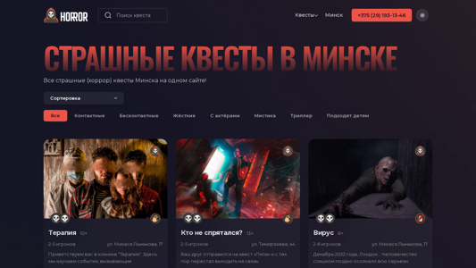 | AI-анализ | The website Horror.by is a platform for booking horror quests in Minsk, Belarus. It offers various types of horror quests, including contact and beacon-free, immersive, and mystical quests with or without actors. Users can sort the quests by level of fear, contact level, rating, and age. The website provides information about the location, number of players, and a brief description of each quest. Examples include "Who did not hide?" with a rating of 13+ for 2-5 players, "Virus" with a rating of 8+ for 2-6 players, and "Obitel demons" with a rating of 13+ for 1-5 players. The website also includes contact information for booking. |