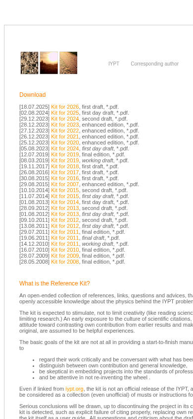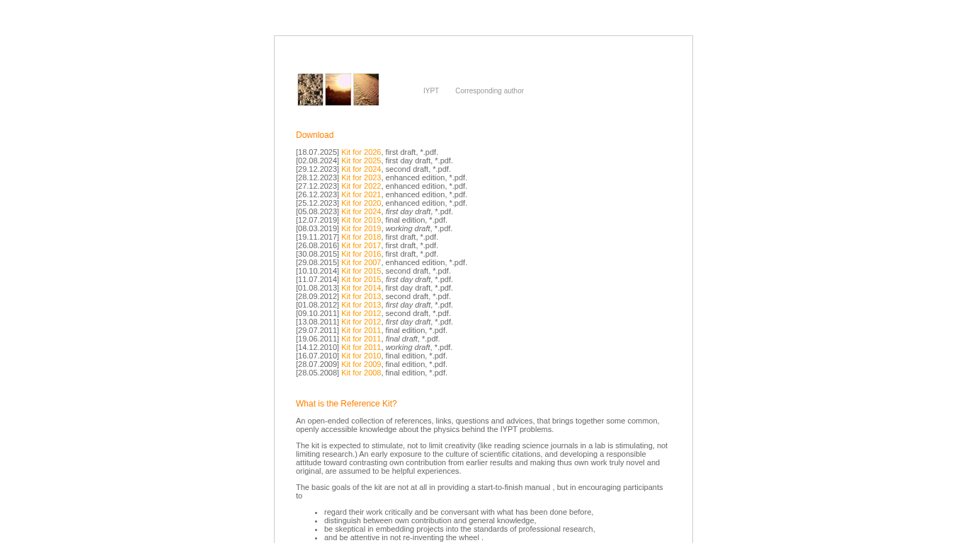 | AI-анализ | The web project "IYPT Reference Kit" is a collection of references, links, questions and advices for the International Young Physicists' Tournament (IYPT). The kit aims to stimulate creativity and encourage responsible scientific citation, providing an early exposure to the culture of scientific research. The website offers multiple drafts and final editions of the IYPT problem kits in PDF format, dating back to 2007. Each PDF is labeled with its respective year and draft status. The project is accessible at kit.ilyam.org. |