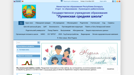 | AI-анализ | The portal "Лунинская СШ" (Lunin School) is a government educational institution website based in Belarus. It contains a variety of information related to the school, including news, class schedules, and student services. The website uses cookies and complies with the data protection policy of the Ministry of Education of Belarus. The site includes sections for parents, teachers, and students, as well as information on the history and organization of the school. The most visited pages include those related to the sixth school day, a memory and tribute section for graduates, and a section on safety and anti-corruption measures. The site also features a calendar, a contact page, and a map of the school's safe route. The website's administrator is Sergii Kurak and can be reached by phone at 80164795245 or by mail at the provided |