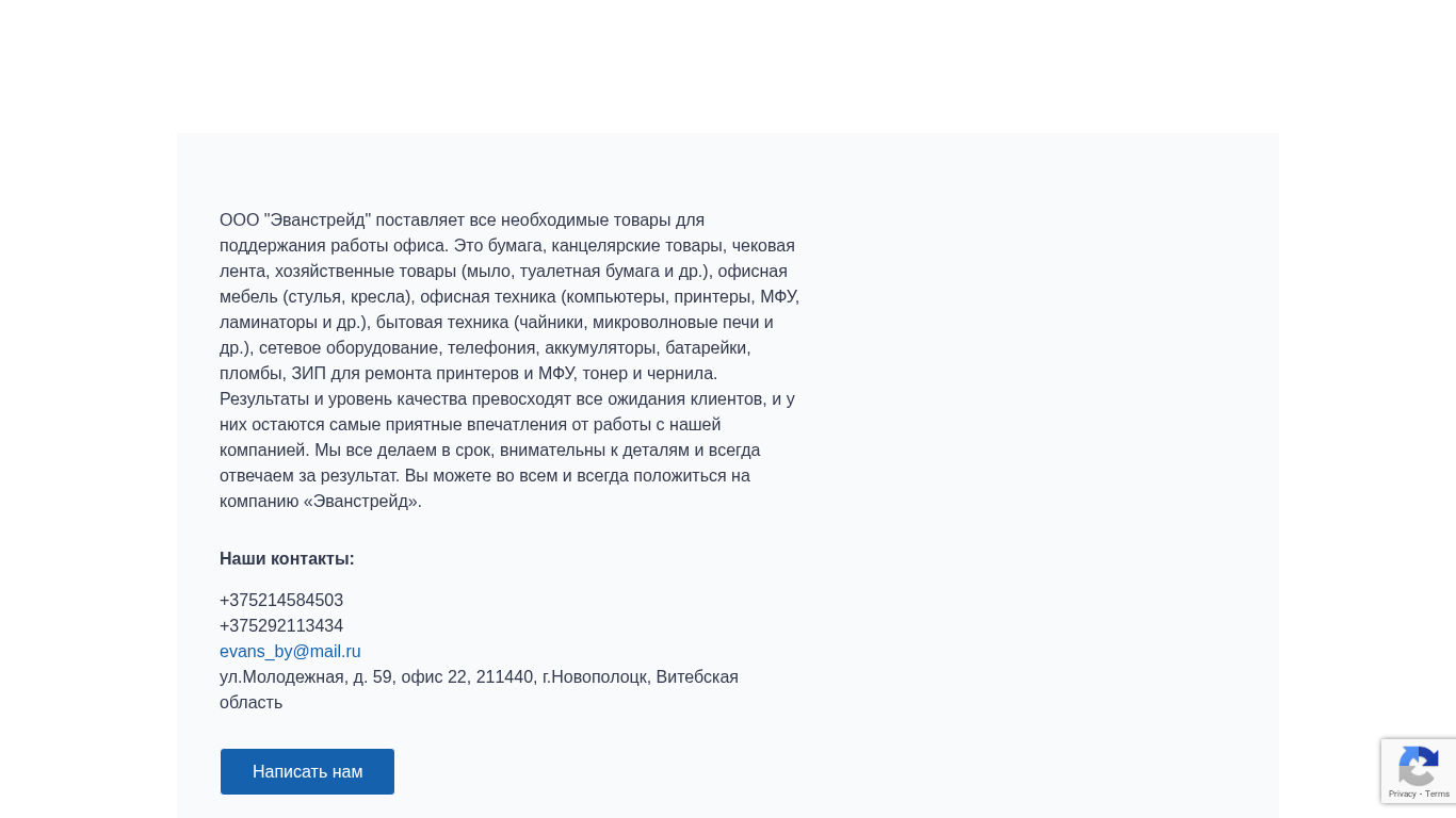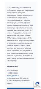 | AI-анализ | --- The website evans.by is an online business catalog for Office OOO "Evanstreyd". It offers a wide range of office supplies, including paper products, stationery, check paper, household goods (soap, toilet paper, etc.), office furniture (chairs, desks), office equipment (computers, printers, multifunction devices, laminators), home appliances (teapots, microwave ovens), network equipment, telephony, batteries, accumulators, fuses, and toner and ink for printers and multifunction devices. The company prides itself on exceeding clients' expectations with high-quality results. All orders are completed on time, with attention to detail, and the company guarantees the outcome. Clients can contact the company at +375214584503, +37529211343 |