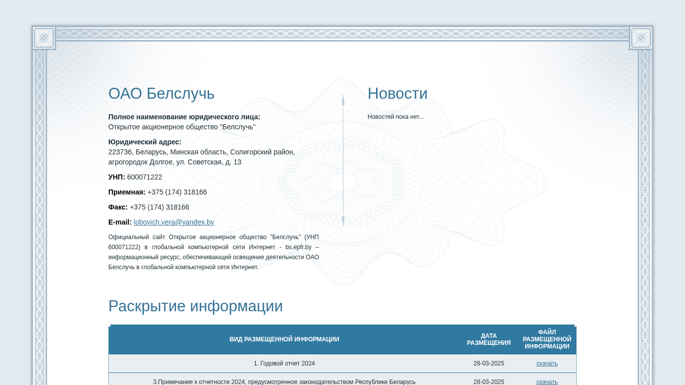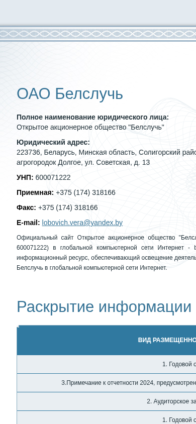 | AI-анализ | The web project <Белслучь ОАО> (bs.epfr.by) is an informational resource for Open Stock Company "Belsluchy" (UNP 600071222) in the global computer network Internet. It provides access to various reports and auditor's conclusions for the years 2010-2025. The website offers downloadable versions of annual reports and auditor's reports for each year, including 2024, 2023, 2022, 2021, 2020, 2019, 2018, 2017, and 2016. Additionally, there is information regarding the formation of the register of shareholders and auditor's reports for those years as well. The website is developed by ep |