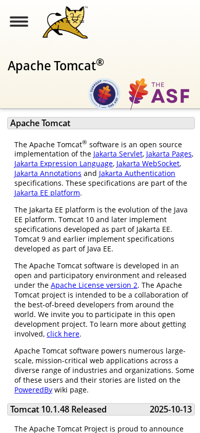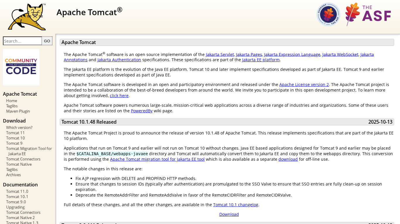 | AI-анализ | The web project "Apache Tomcat®" is an open-source implementation of the Jakarta Servlet, Jakarta Pages, Jakarta Expression Language, Jakarta WebSocket, Jakarta Annotations, and Jakarta Authentication specifications, which are part of the Jakarta EE platform. Apache Tomcat is developed in an open and participatory environment and released under the Apache License version 2. The project aims to be a collaboration of the best-of-breed developers from around the world, and users are invited to participate. Apache Tomcat software powers numerous large-scale, mission-critical web applications across various industries and organizations. The website offers downloads for different versions of Tomcat, including Tomcat 11, Tomcat 10, and Tomcat 9, as well as migration tools, connectors, and taglibs. Users can find documentation, troubleshooting resources, and |