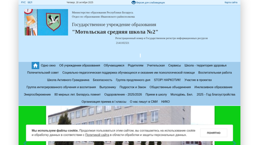 | AI-анализ | The website <http://mot-upk.ivanovo.edu.by> is titled "Мотольская средняя школа №2" (Motolskaya srednaya shkola №2, Motorla Secondary School №2) and uses cookies. It has a heavy focus on the terms "school", "education", and "news" with related words such as "calendar", "students", and "advice". The keywords include "Belarusian republic", "Motolskaya secondary school №2", and "education". The website is primarily in the Belarusian language with some use of Russian. |