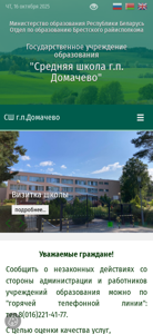 | AI-анализ | The portal domachevo.roobrest.gov.by is the main page for the school in Domachevo, Belarus. The title of the page is 'Главная страница - СШ г.п.Домачево'. The description includes words like 'подробнее', '2025', 'октября', 'школа', 'график', and 'безопасность', among others. The top_words list indicates that the page has information on the school's schedule, safety measures, and detailed information. The language options offered are Russian, English, and Belarusian. The domain is registered under the .BY extension for Belarus. |