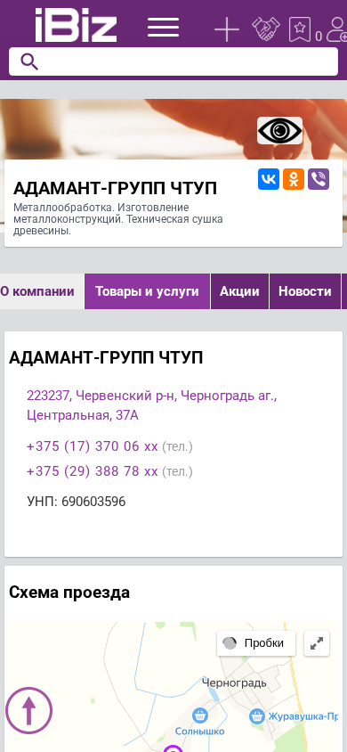 | AI-анализ | The web project "Adamant-Grupп ЧТУП" specializes in metal processing, manufacturing metal constructions, and technical drying of wood. The company is located in Chernograd Agency, Centralna Street, 37A, in Cherven District, Minsk region, Belarus (223237). The contact numbers provided are +375 (17) 370 06 xx and +375 (29) 388 78 xx. The company's Unified State Register number is 690603596. The project does not contain any visible schema for reaching the location or business hours. |