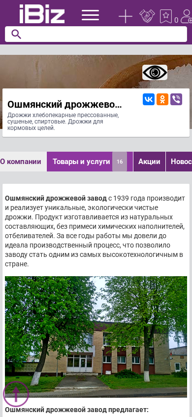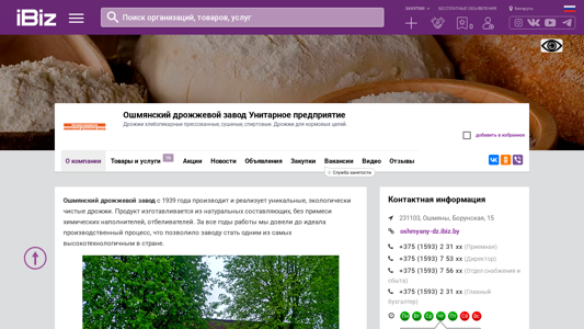| AI-анализ | This website is for the Oshmyany Drozhzhoy Zavod Unitarne Predpriyatie, a Belarusian company specializing in the production and sale of various types of dairy yeast. The title of the website includes the phrases "Дрожжи хлебопекарные прессованные, сушеные, спиртовые. Дрожжи для кормовых целей" which translate to "Bread Yeast: Pressed, Dried, Spirtoous. Yeast for Feedstock." The company's address and contact information are also provided. The website appears to be part of a larger platform, as indicated by the presence of various menus and links for related services such as "Закупки" (purchases) and "О компании" (about the company). The top words on the website include "дрож |