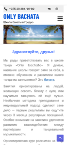 | AI-анализ | This website, titled "Only Bachata – Школа бачаты в Гродно," is a dance school specializing in the teaching and development of Bachata dance. The name of the school implies that it focuses on the education and improvement of which dance? It is Bachata. The lessons cater to individuals who wish to learn Bachata from scratch or to improve their existing skills. An unusual teaching method and individualized approach ensure that students begin to see results within three months of regular attendance. The lessons place significant emphasis on the development of partner interaction and musicality. The course is estimated to last approximately one year. This duration is sufficient to master all aspects of Bachata, given a serious commitment to learning. The atmosphere in the studio is friendly, humorous, and productive. In addition to lessons, events such as parties, open-airs, and outings to nature are organized. The teaching takes place in a spacious hall equipped with |