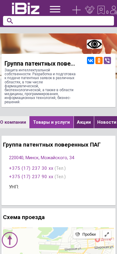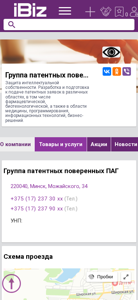 | AI-анализ | This online resource is a patent law firm named Группа патентных поверенных ПАГ - Защита интеллектуальной собственности, located in Минск, Belarus, at Можайского, 34. The company offers patent application development and preparation services in various fields, including pharmaceuticals, biotechnology, medicine, programming, information technologies, and business solutions. The website provides contact information, including two phone numbers and an email address, as well as a map scheme and business hours, which are from 9:00 AM to 6:00 PM, Monday through Friday, with Saturdays and Sundays being holidays. The company's services are listed under the categories of "Patent Services" and "Services in Minsk." |