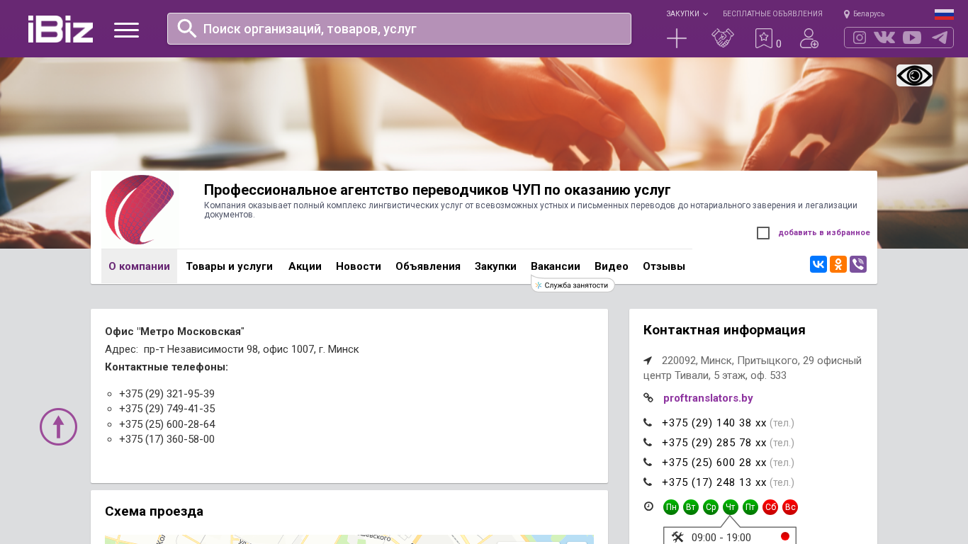 | SEO-описание | Профессиональное агентство переводчиков ЧУП по оказанию услуг - Компания оказывает полный комплекс лингвистических услуг от всевозможных устных и письменных переводов до нотариального заверения и легализации документов. . Схема проезда, контактные телефоны, адрес компании Профессиональное агентство переводчиков ЧУП по оказанию услуг. 220092, Минск, , Притыцкого, 29 офисный центр Тивали, 5 этаж, оф. 533 |