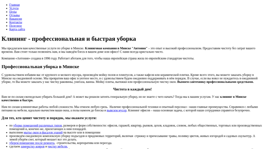 | AI-анализ | The web project "Антония.by" is a cleaning company based in Minsk, Belarus, established in 1996. It is an acknowledged leader in cleaning services in Minsk, as evidenced by its tagline "Клининг у нас в крови!" (Cleaning is in our blood!). The website offers professional and quick cleaning services for homes and offices in Minsk. Keywords associated with the site include "клининговая компания номер один" (top cleaning company), "клининг офисов в Минске" (office cleaning in Minsk), and "лучшая клининговая компания Минска" (best cleaning company in Minsk). The site's top words include various cleaning-related terms such as "уборка" (cleaning), "чистка |