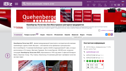 | AI-анализ | The web project "Квенбергер Логистикс Бел" is a Belarusian international enterprise specializing in a full range of transport, warehouse, and customs logistics services. It offers transportation solutions for air and sea freight, as well as warehouse logistics. The company provides both domestic and international cargo delivery by road transport and offers transportation services for air and sea freight. Additionally, it deals with tire industry. The company is located in Minsk, at the address Шафарнянская, 11-419, Бизнес-центр Порт. |